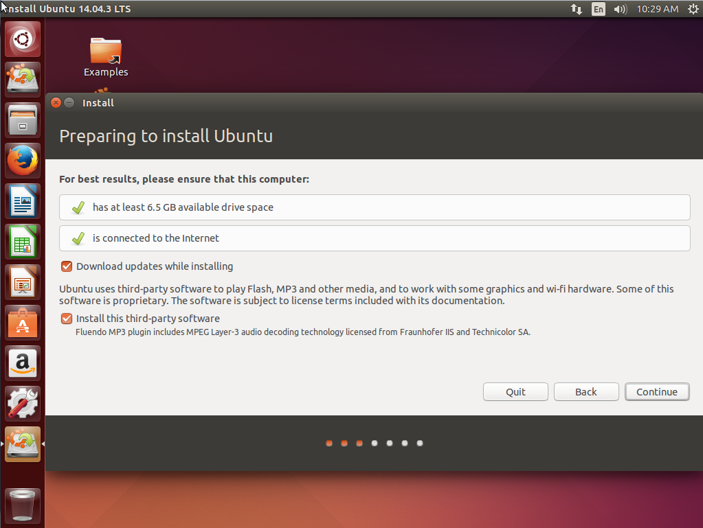 In the second screen the installer will check if you are good to go. It will see if you have enough disk space, if you have an internet connection and if you are connected to power. You can install while running from a battery, but if your battery dies during the install, you might end up with a laptop that will not start anymore. At least not without fixing all kinds of stuff. If you do not have an internet connection you can setup your wireless network here in this dialogue or click on the wireless network icon at the right top of the screen. Below image only shows the network cable icon, but if you have wireless, you should see the wireless icon right there. If you have an internet connection setup, you can select the boxes: