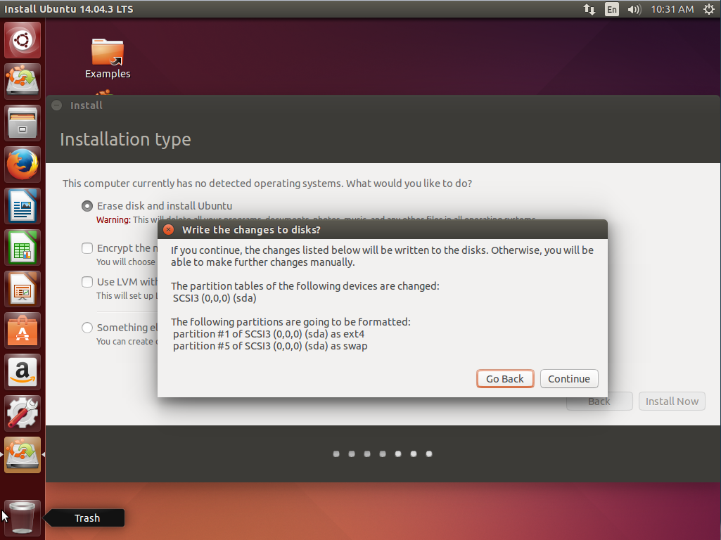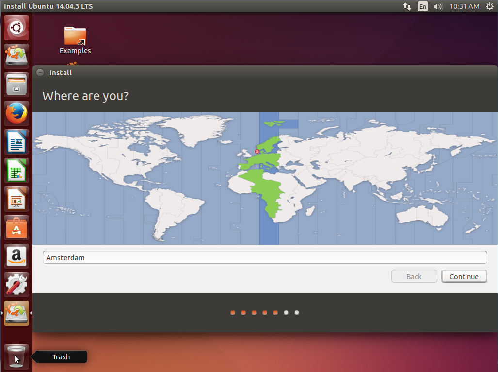 Then it is time to choose where to install Ubuntu. Below screenshot shows you my installation onto an empty hard disk (on a virtual machine). If you still have another operating system install on your hard disk, like let’s say Windows, you will also see the option to erase your current OS and replace it with Ubuntu or to install Ubuntu along side of your already installed OS. The Ubuntu installer will figure out the ‘best’ partitioning needed. In most cases the suggested partitioning will be OK, but be sure to check it carefully. Windows partions can and will be re-sized without problems. Just be sure you will have enough disk space left for your other OS and that you do not accidentally overwrite / delete data you need. As always, it is wise to have backups of all of your data and that you have restore media for your OS if you ever need to restore your system.
